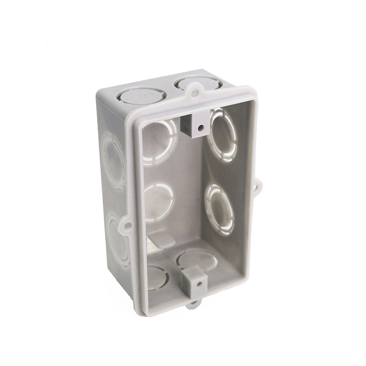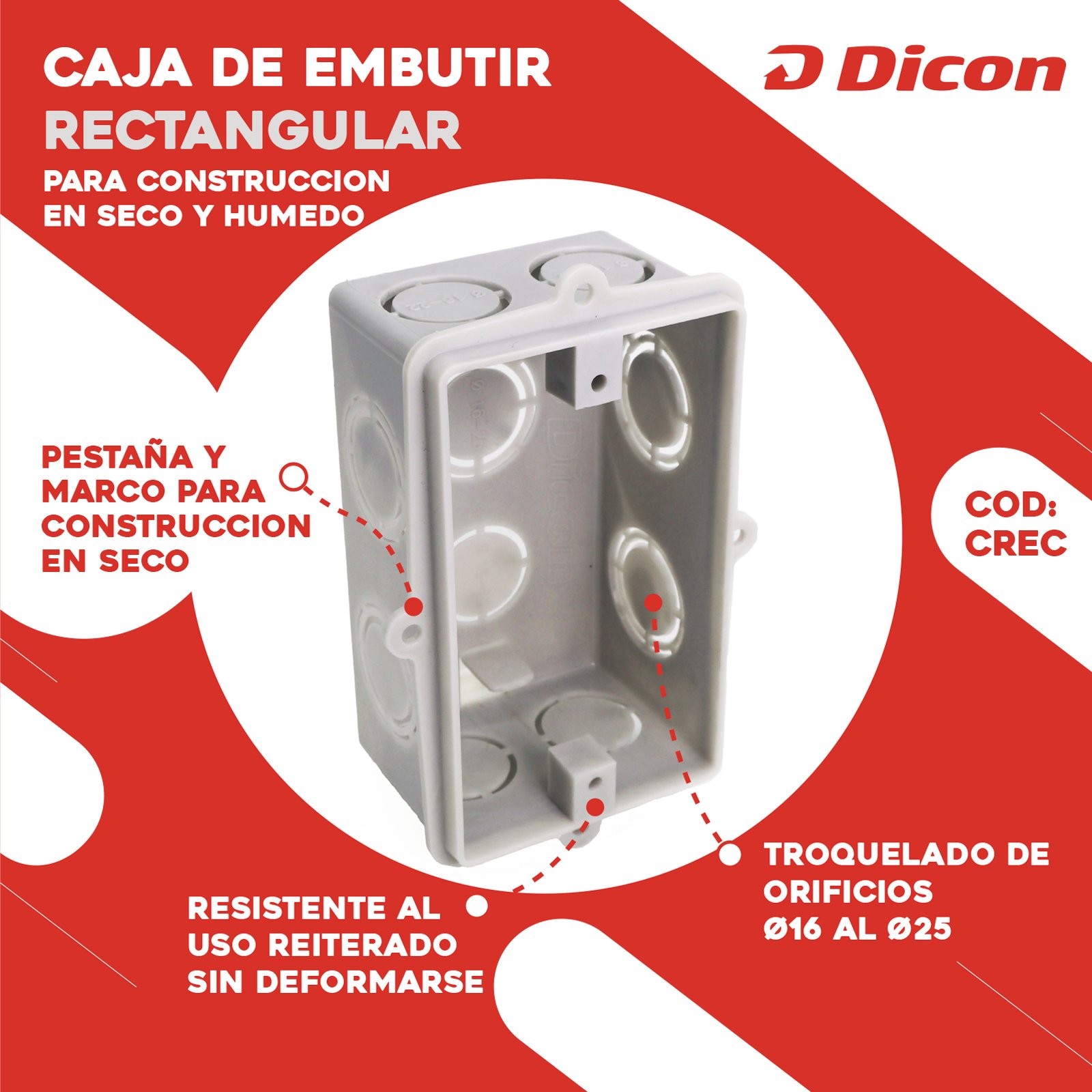Caja de embutir rectangular de plástico resistente, apta para construcción en seco y húmedo. Con pestaña y marco reforzados para un ajuste firme del bastidor. Orificios troquelados Ø16 a Ø25 que facilitan la instalación. Resistente al uso reiterado sin deformarse, ideal para una instalación segura y prolija.