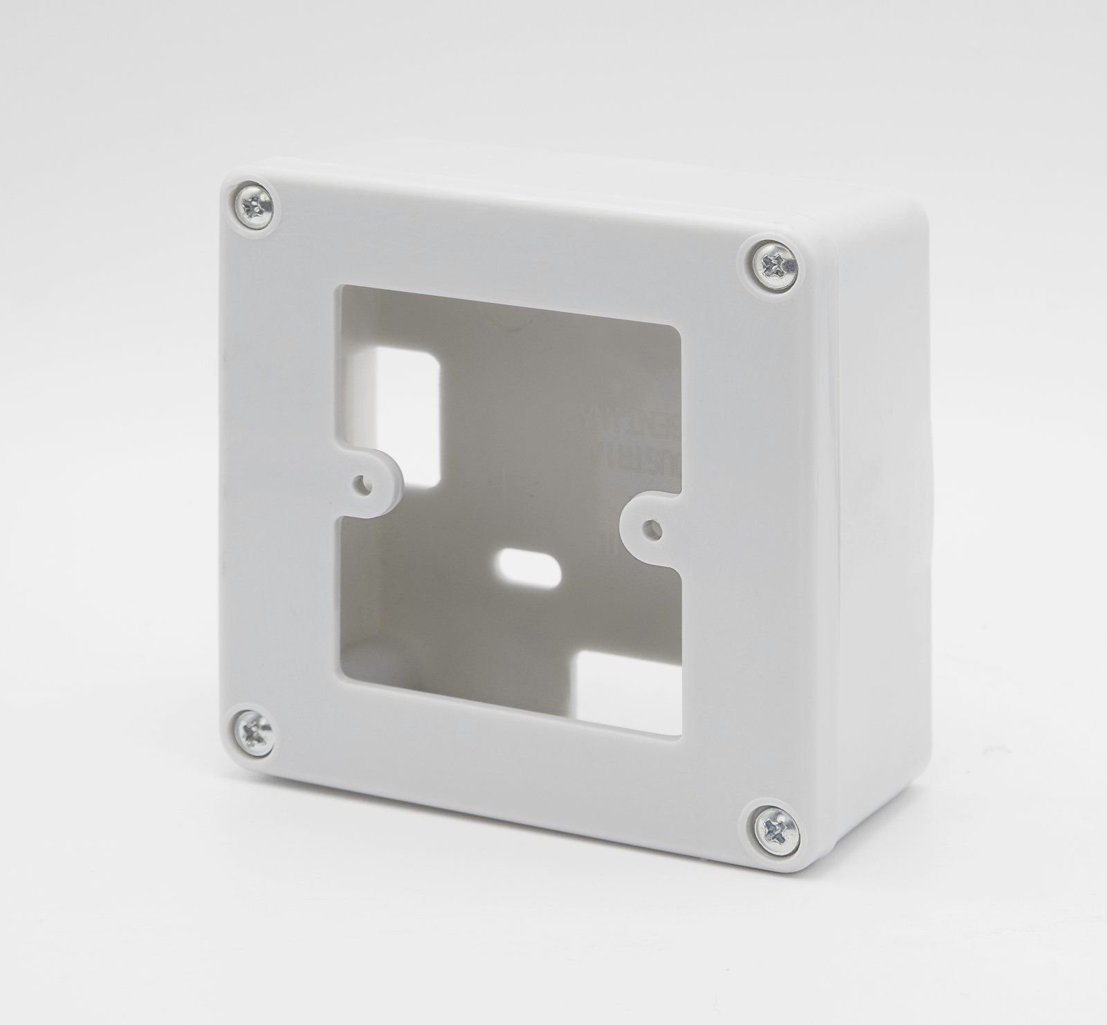 Caja de superficie plástica utilizada para alojar mecanismos eléctricos visibles. Ofrece una solución práctica y estética en instalaciones donde no es posible embutir cajas en la pared.